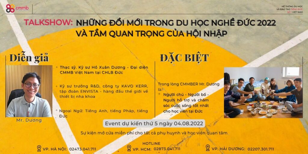 Cập nhật: Talkshow trò chuyện trực tiếp cùng đại diện CMMB đã diễn ra thành công tốt đẹp tại văn phòng Hà Nội cùng với sự góp mặt của các bạn học viên, các vị phụ huynh. Xuyên suốt buổi trò chuyện, các thắc mắc đều được anh Dương giải đáp rõ ràng và kỹ lưỡng trong bầu không khí thoải mái và thân mật. Giờ đây, anh Dương đã quay trở lại Đức để tiếp tục công việc của mình, thực sự chờ mong ngày được gặp lại và tiếp nối những câu chuyện còn chưa kể hết tại đây.